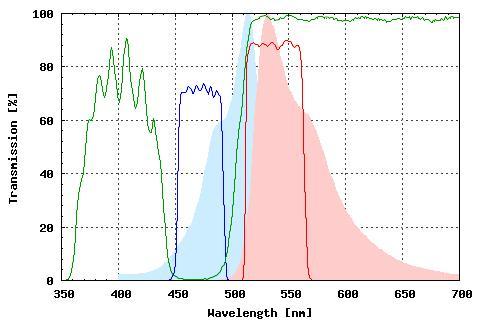 Exciter is a 475AF40. Dichroic mirror is a 505DRLP. Emission (barrier) Filter is a 535AF45. Absorption and emission spectra is for TOTO-1 fluorochrome.